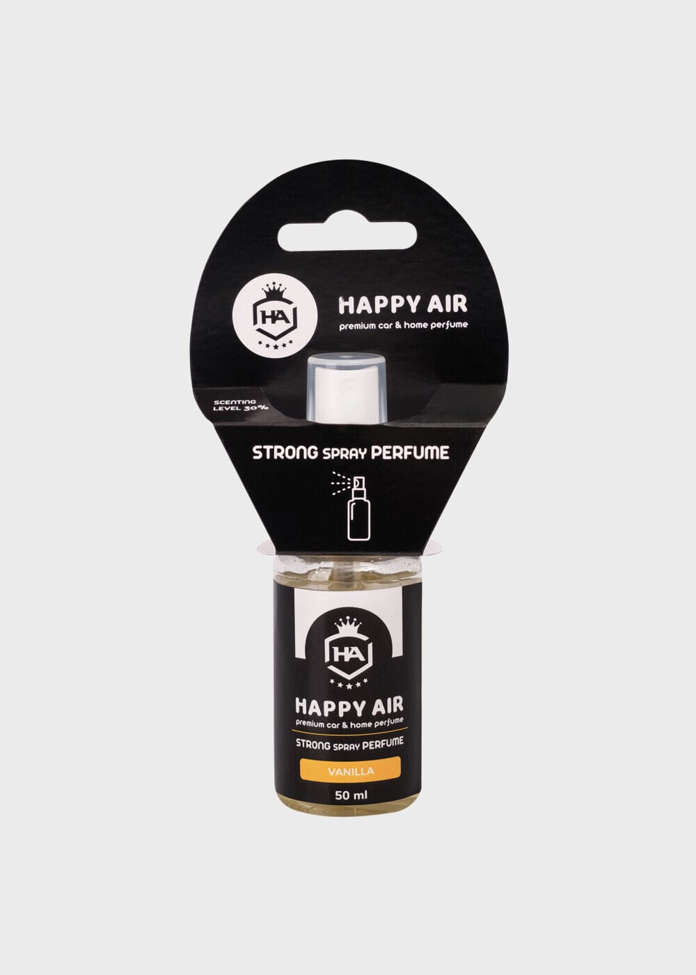 HAPPY AIR STRONG SPRAY PERFUME VANILLA е нешто повеќе од обичен освежувач на воздух со концентрација на мирис од 30%. Едноставно топол, полн и богат мирис на ванила.